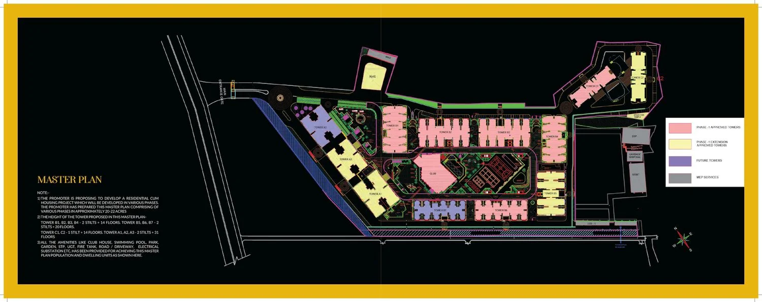 Residents can enjoy a wide range of amenities such as 7.5m wide roads, over 3,000 trees, 10,000 shrubs, a central lobby, multi-purpose hall, open gym, sports courts, separate pools for adults and children, and a kids’ play zone. Additional features include a senior citizens’ area, landscaped gardens, pergola seating, café, library, spa, and jacuzzi.