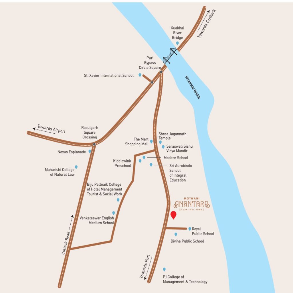 The project is located in Jharapada, Bhubaneswar, adjacent to the Puri Bypass, with excellent connectivity to schools, hospitals, and commercial hubs.