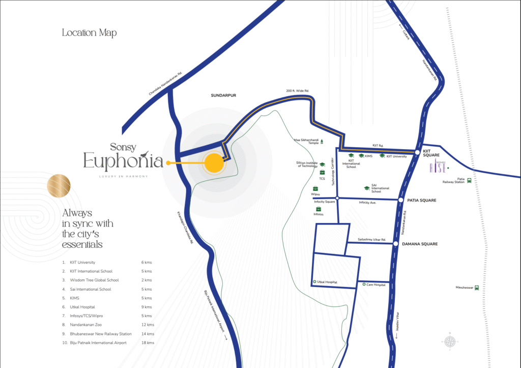 Spread across 8 high-rise towers, Sonsy Euphonia comprises 479 units and comes equipped with a range of lifestyle-enhancing amenities including a swimming pool, gymnasium, and clubhouse. Its strategic location in Patia places it close to key landmarks such as KIIT University, DN Wisdom Global School, and reputed healthcare facilities, making it a highly convenient address for families.