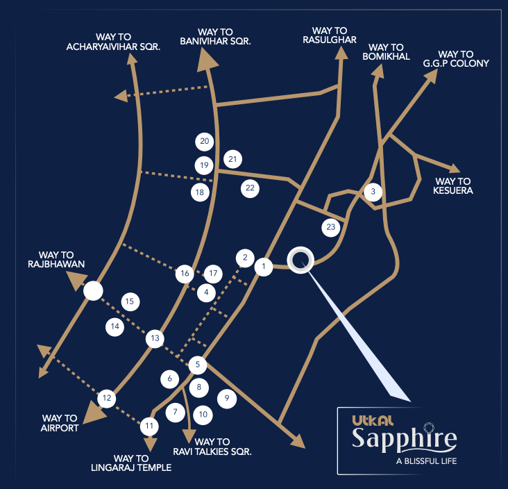 Utkal Sapphire is located in Laxmisagar, Bhubaneswar, a well-connected residential area with proximity to hospitals, markets, schools, and major transit points.